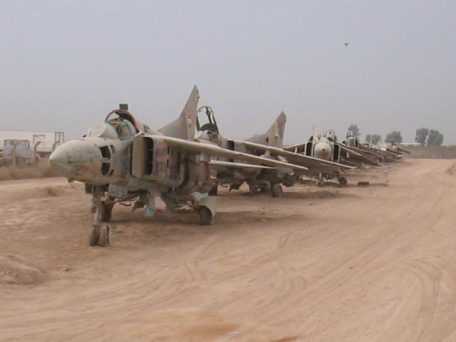 Yes, indeed, and heres the proof. These Migs (again, my analysts, correct me if Im wrong) were wisely left to rot in the desert instead of facing a superior US Air Force. And its lucky for us because we get a photo op out of em! The American troops (and Polish, and Phillipinos, and Pakistanis, etc etc) defaced the birds with all kinds of interesting slogans. Maybe it will be a memorial park one day? |